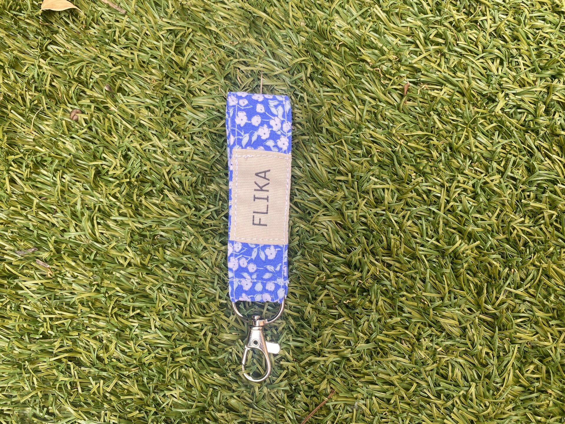 Llavero flores azules y blancas